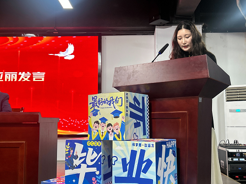 班主任代表朱亚丽老师上台发言。在同学们的校园生活中,班主任老师们始终如温暖的守护者,陪伴着大家度过每一个成长瞬间,见证着大家的进步与蜕变。朱老师的发言情真意切,字里行间流露出对同学们深深的不舍与牵挂,那浓浓的师生情也让在场的每一个人都为之动容。