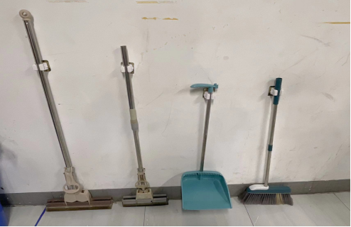 2.扫把与拖把从左往右依次排开并挂在挂钩上,保持整洁。