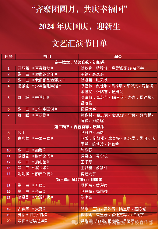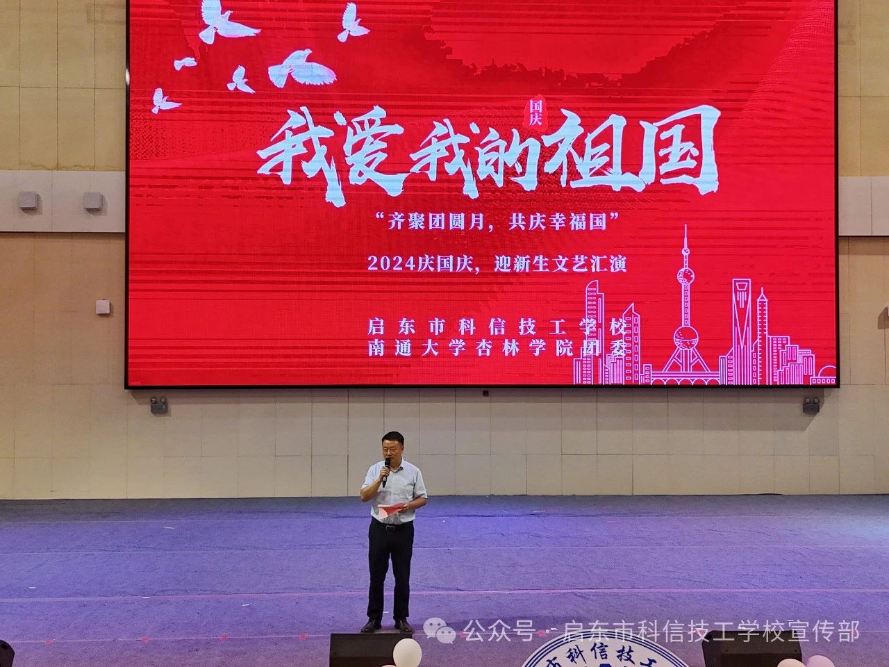 带着丰收的憧憬、迎着九月的金秋;带着满怀的豪情,共贺祖国的生日。为庆祝国庆佳节,迎接新同学,进一步增强我校节日的氛围,丰富学生的文化生活,启东市科信技工学校联合南通大学杏林学院团委,于2024年9月26日,在南通大学启东校区体育馆,举办了启东市科信技工学校“齐聚团圆月,共庆幸福国”2024年庆国庆,迎新生文艺汇演。