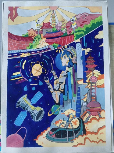 由姜赟老师指导的成欣冉同学的获奖作品《匠魂燃梦·技启新程》融合了传统与现代、地球与太空的构想,画面上方,中国传统建筑风格的城墙与塔楼巍峨屹立,下方则是浩瀚的太空、宇航员、卫星与行星交相辉映。画面的中央,宇航员似乎在与太空元素亲密互动,富意着科技与人文的和谐共生。整体颜色鲜明,充满活力,既表达了对历史的尊重与传承,又寄托了对未来的无限憧憬,是对科技发展与文化传承的赞颂。