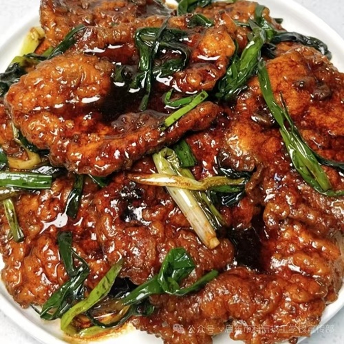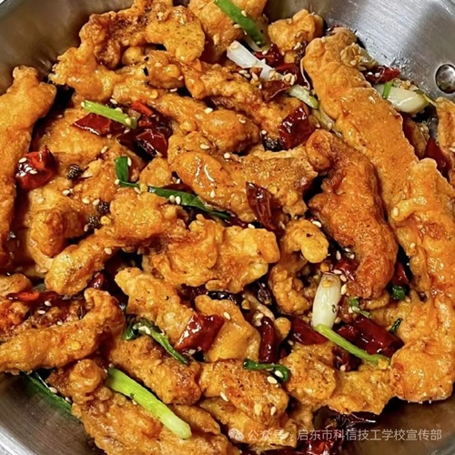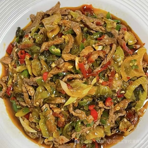 午餐川煮肉片、锅包肉、杏鲍菇炒蛋、蒜茸西胡芦