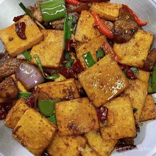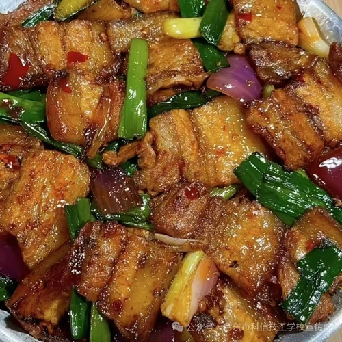 午餐油豆腐烧肉、川湘回锅肉、炒白菜、青椒土豆片