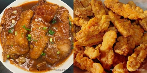 丰富午餐炸大排、肉皮三鲜、西红柿炒蛋、蒸南瓜