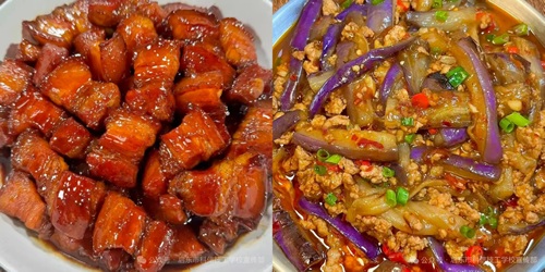 丰富午餐红烧肉块、肉沫炖蛋、鱼香茄子、文蛤菜