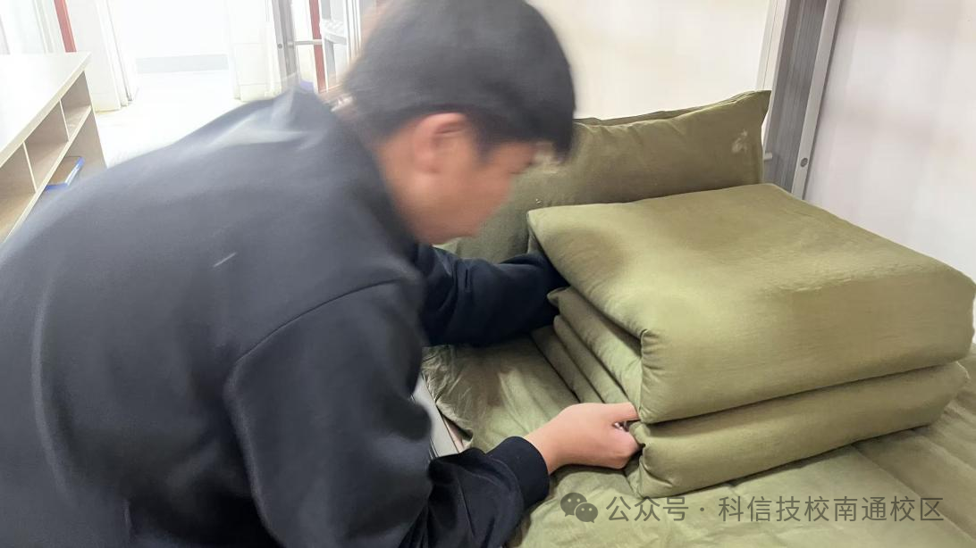 “被子要叠成‘豆腐块’,棱角要分明”“物品摆放要对齐桌面中线”“集合速度不能超过3分钟”……6天前,当启东市科信技工学校特训班的规则刚公布时,不少学生还带着抵触与迷茫——有人习惯了房间里的“随手乱放”,有人对严格的作息管理满心抗拒,更有人觉得“这些小事没必要较真”。