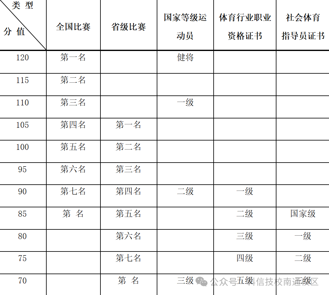 附:体育专业技能成绩认定对照表