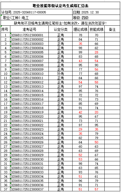 2025年12月30日2025-32068117-00005批次电工四级成绩公示