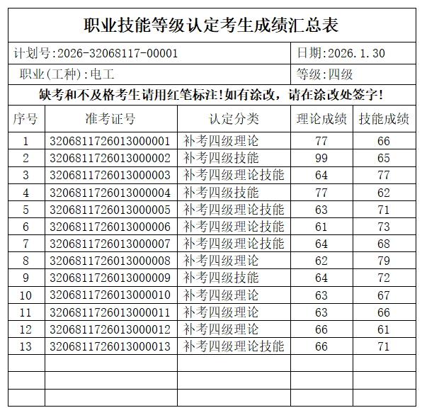 2026年1月30日2026-32068117-00001批次电工四级成绩公示