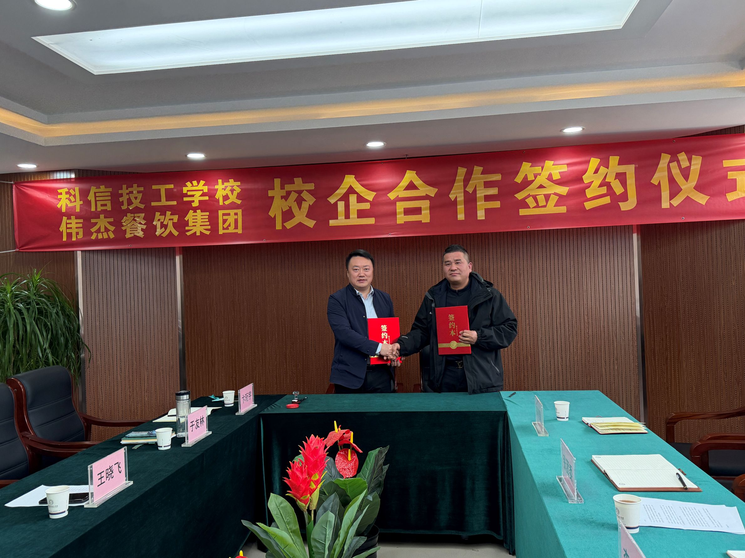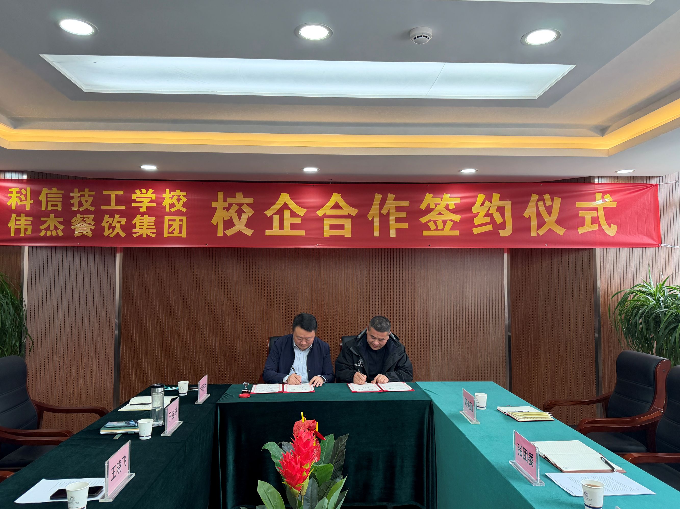 随后,在全体参会人员的共同见证下,王晓飞书记与张团委董事长代表双方签订了《校企合作协议》,明确了合作宗旨、合作期限、合作内容及双方权利义务,标志着我校与伟杰餐饮集团的校企合作正式拉开序幕。根据协议,双方将围绕订单式人才培养、校内外实训基地共建、师资双向交流、学生实习就业对接、技术研发与成果转化等方面开展深度合作,同时可根据实际需求,推进校园餐饮服务等相关合作,实现校地共建、互利共赢。