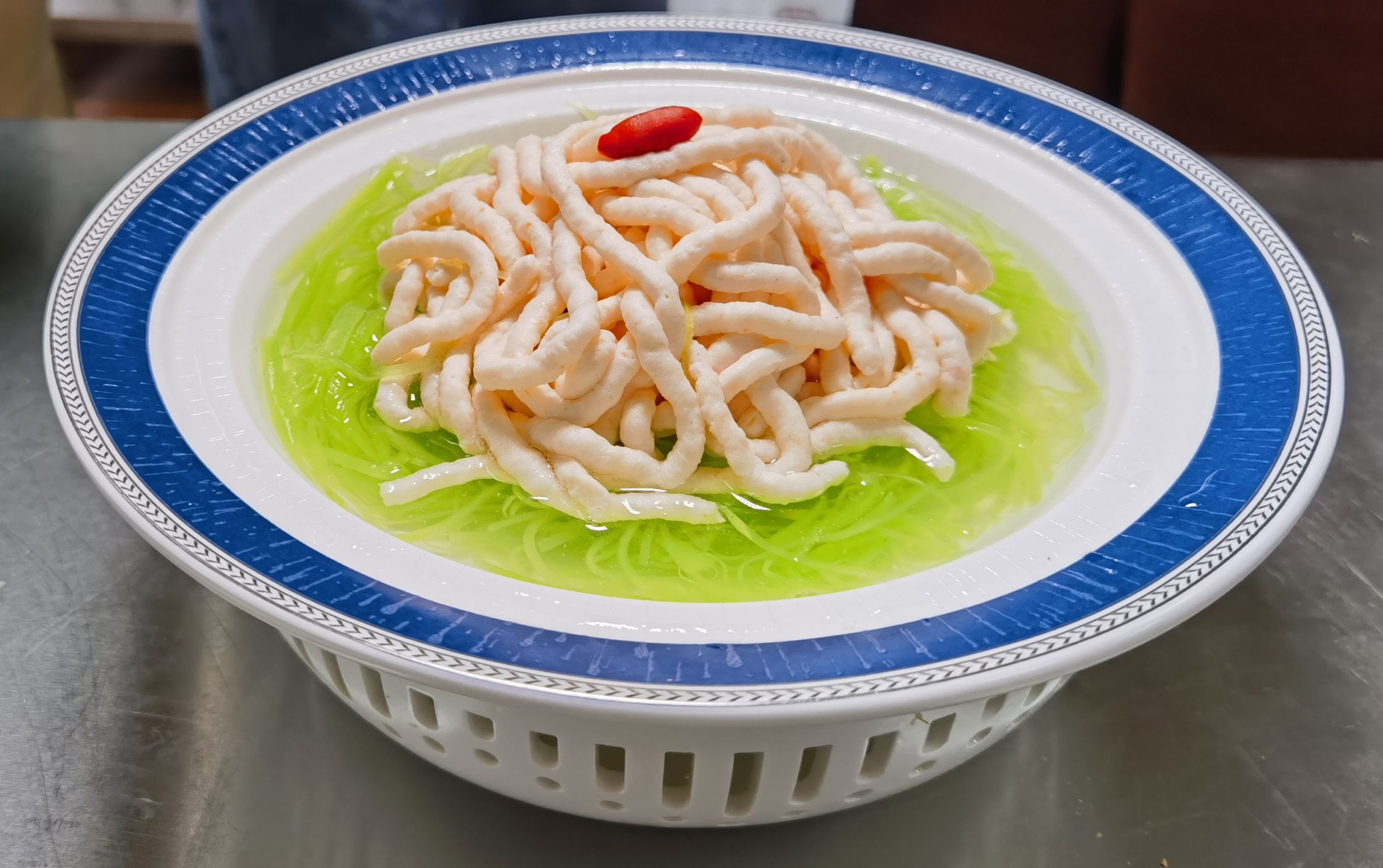 第一道就是这道颜值超高的翡翠鲜虾线,光听名字就像一首小诗。这道菜取莴笋之翠,鲜虾之鲜。《清异录》载莴笋名"千金菜",隋代重金求种,《本草拾遗》说它"利五脏,通经脉",正合春日清润养生。难怪古人偏爱,"春令莴笋似黄金"。虾线滑嫩,莴笋脆爽,鲜而不腻,虾胶要调制得宜,莴笋先腌更脆,火候一到,自然鲜清可口。恰似读书,慢品方知滋味。一口翡翠鲜虾线,半卷春蔬食养诗,不负春光,不负书香。