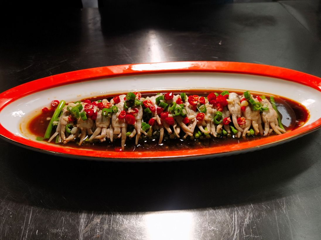 蛏心如意,名字吉祥,鲜味十足。蛏子春初最肥,清《宁海县志》称它"西施舌",清代张凤翔有诗赞:"玉骨琼肌冰雪质,最饶风味美人蛏"。蛏子清润滋补,调和脾胃,吐沙净,火候准,方能鲜而不腥,嫩而不老。读书明理,做菜懂味,道理相通。蛏心如意,满口海韵春意,更有古籍诗韵相伴,真是称心如意。