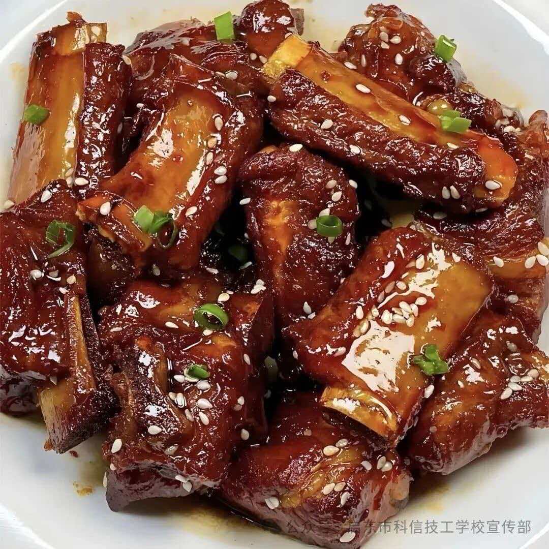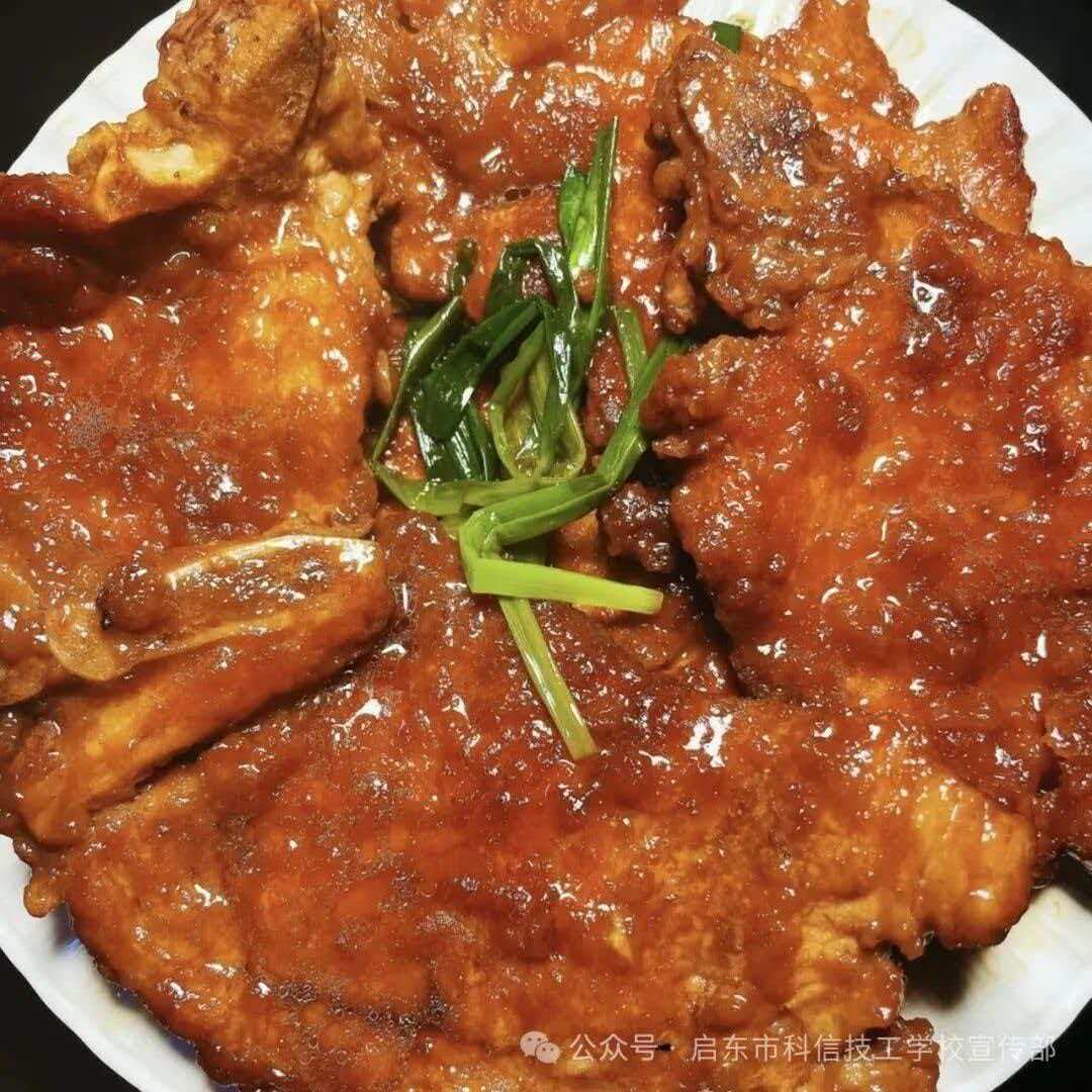 糖醋排骨、洋葱炒蛋、玉米粒炒火腿、白菜、莴笋蛋汤