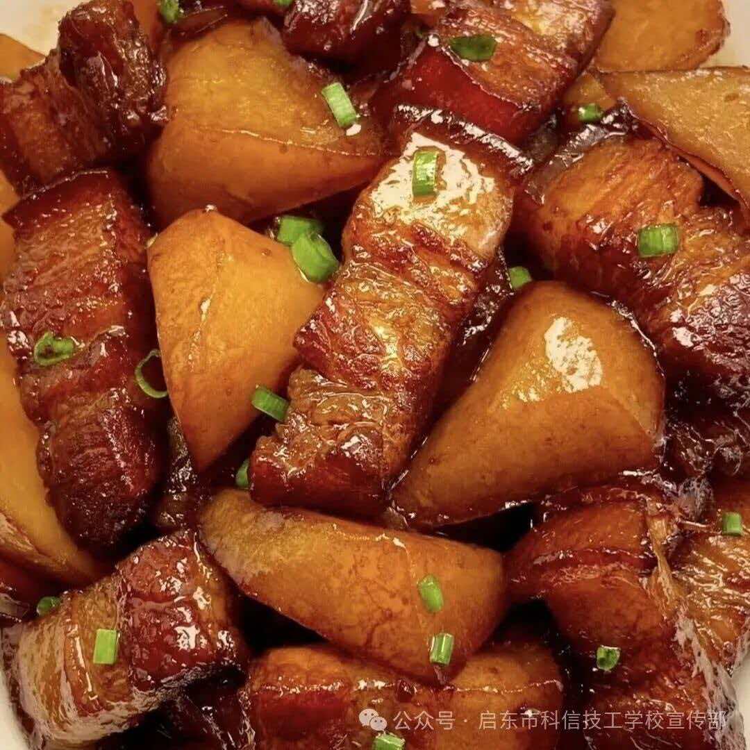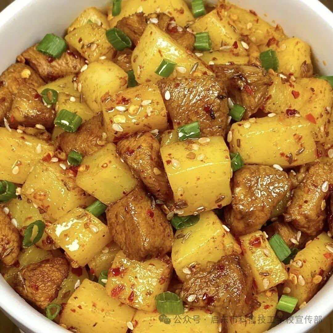 京酱肉丝、火腿炒年糕、腐竹三鲜、青椒土豆丝、紫菜豆腐汤
