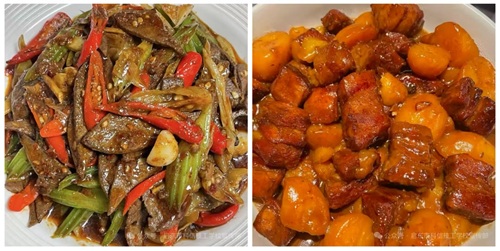 红烧肉土豆、 麻辣香锅丸子、干锅花菜、如意卷