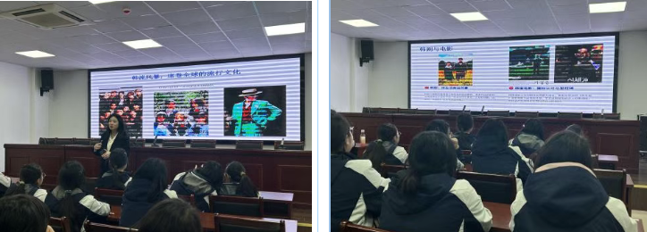 围绕“韩流”话题,娜娜老师从K-POP与影视剧两大载体出发,剖析了韩国文化产业在本土社会的实际影响力。她指出,韩流不仅是一种娱乐现象,更深刻影响着年轻人的价值观念、生活方式及消费行为。她结合自身接触韩国娱乐产业的经历,理性分析了偶像文化、粉丝文化在当代韩国社会中的位置与意义,引发学生对文化传播与社会心理之间关系的深入思考。