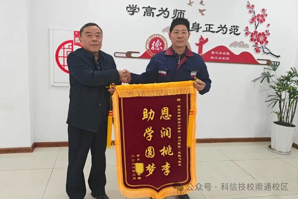 接过这面承载着信任与感激的锦旗,徐校长及校领导们深受触动。他们表示,教育的本质是温暖与陪伴,启东市科信技工学校南通校区始终坚守“不让一个学生因贫辍学”的初心,持续关注困境学子的成长需求。未来,学校还将进一步完善助学体系,用实际行动为学子们的求学之路保驾护航,让每一位科信学子都能在温暖的校园环境中逐梦成长,绽放光彩。