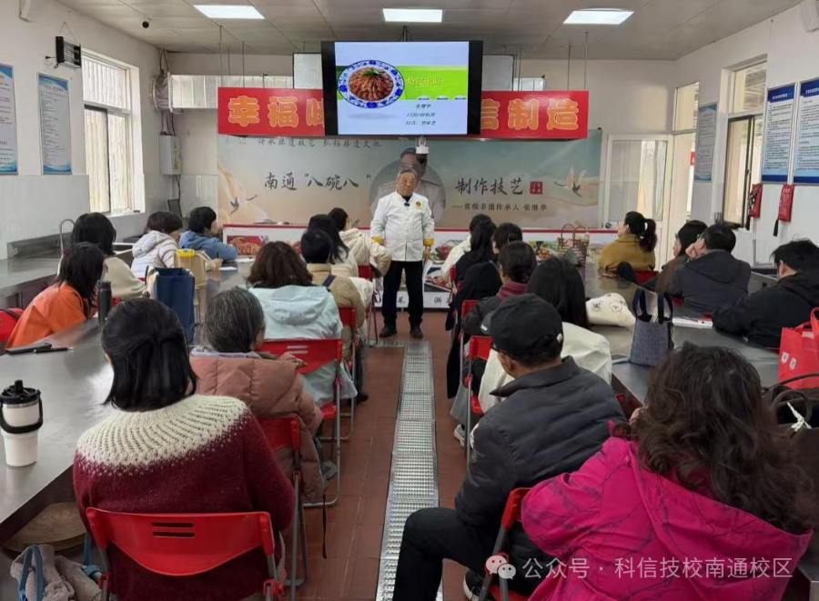 2026年3月21日,由中国烹饪大师、高级营养师、高级技师、高级讲师、省级非遗传承人张继华大师主讲的江苏省非遗“南通八碗八”制作技艺培训班(2026级第一期)在我校崇川校区隆重开课!学校各级领导高度关注本次非遗班开课,他们和来自社会各界的30多位参训学员共同见证了这一全市首创的人才培养创新实践模式正式启动。